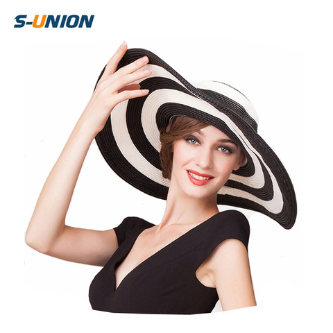 S-UNION 새로운 패션 여름 큰 챙 해변 태양 숙녀 모자 여성 흑백 줄무늬 플로피 밀짚 모자